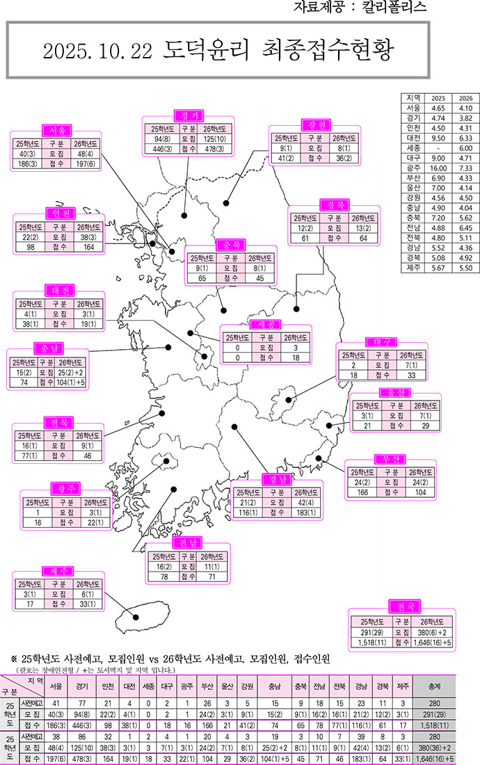 안녕하세요 칼리폴리스입니다. 각 지역별 2026학년도 중등 임용후보자 선정경쟁시험 도덕윤리 최종접수현황입니다. | 지역 | 2026학년도 모집인원 | 접수인원 | 경쟁률 | 교육청 바로가기 | | 서울 | 48(3) | 197(6) | 4.10 | 서울시 교육청 | | 경기 | 125(10) | 478(3) | 3.82 | 경기도 교육청 | | 강원 | 8(1) | 36(2) | 4.50 | 강원도 교육청 | | 대전 | 3(1) | 19(1) | 6.33 | 대전시 교육청 | | 충북 | 8(1) | 45 | 5.62 | 충청북도 교육청 | | 충남 | 25(2)+2 | 104(1)+5 | 4.04 | 충청남도 교육청 | | 광주 | 3(1) | 22(1) | 7.33 | 광주시 교육청 | | 전북 | 9(1) | 46 | 5.11 | 전라북도 교육청 | | 전남 | 11(1) | 71 | 6.45 | 전라남도 교육청 | | 인천 | 38(3) | 164 | 4.31 | 인천시 교육청 | | 제주 | 6(1) | 33(1) | 5.50 | 제주시 교육청 | | 대구 | 7(1) | 33 | 4.71 | 대구시 교육청 | | 경북 | 13(2) | 64 | 4.92 | 경상북도 교육청 | | 경남 | 42(4) | 183(1) | 4.36 | 경상남도 교육청 | | 울산 | 7(1) | 29 | 4.14 | 울산시 교육청 | | 부산 | 24(2) | 104 | 4.33 | 부산시 교육청 | | 세종 | 0 | 0 | 0 | 세종시 교육청 | | 380(36)+2 | 1,646(16)+5 | - | - |