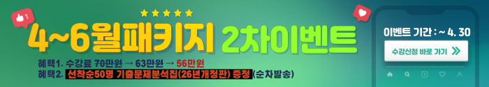 - 구성 : 2026년 기출문제분석반 + 2026년 교과교육론 - 수강료 : ₩700,000 → ₩630,000 (상시 10% 할인) ★ EVENT ★ ※ 2026년 4월 30일까지 결제완료 시- 수강료 할인 ₩700,000 → ₩630,000 → ₩560,000 (20% 할인) - 기출문제분석 2026개정판 제공 (선착순 50명!! , 마감 시 별도 공지) (강의 신청 시 반드시 주소입력 해주세요.)※ 기간 내 연간패키지 결제 시에도 기출문제분석 교재 증정대상에 포함됩니다.